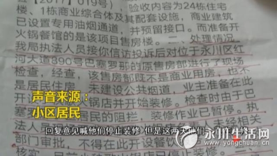 据开发商工作人员称,居民们向区**办投诉之后,**办将相关事项移交给了环保局进行回复处理。随后,记者到永川区环保局进行了求证。工作人员表示,当时确实是他们进行的**回复,根据他们后来的核实,那栋楼的确属于商业用地,也可以用作开餐饮。