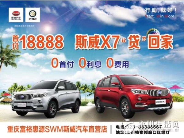 重庆惠源汽车销售有限责任公司成立于2016年5月20日,位于永川玉屏北路361号植物园路口山水人家,紧邻永川汽摩机电城和永川汽车一条街,2017年5月公司成立斯威汽车永川直营店,并成立重庆富裕惠源汽车销售有限公司,主要经营:奔驰、宝马、雪佛兰、大众、日产、福特、长安、哈弗等综合品牌,是斯威汽车永川地区唯一厂家授权经销商。