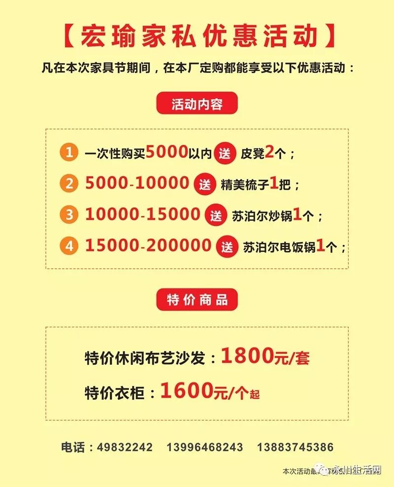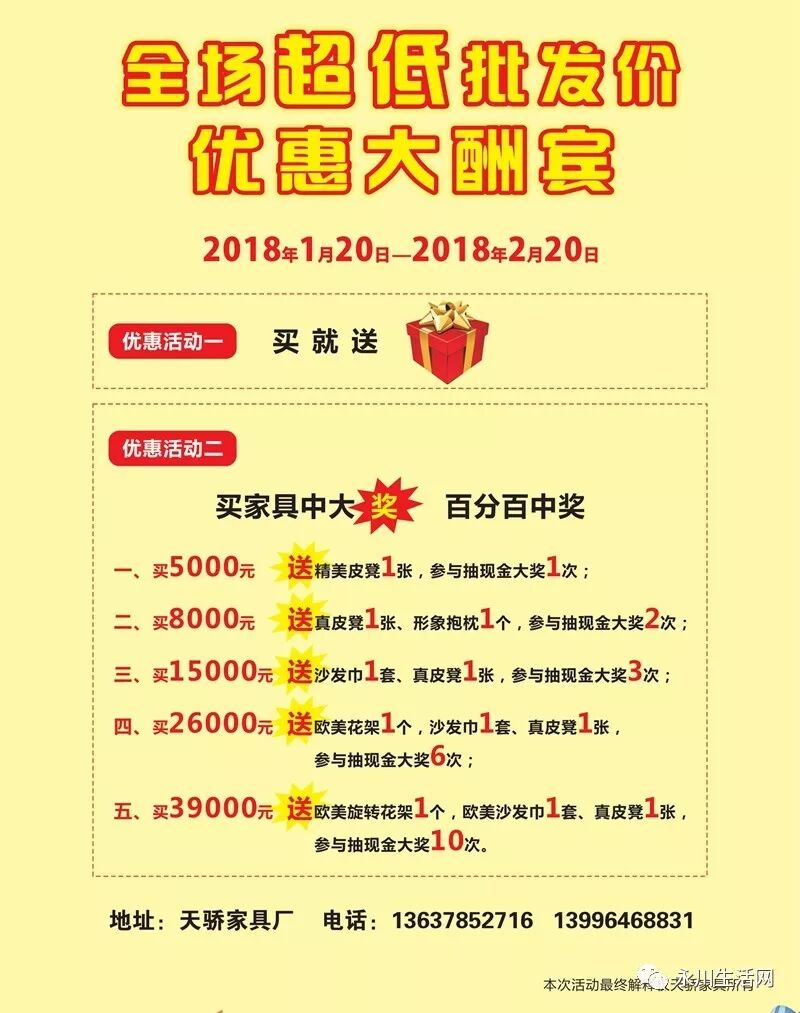 本届青峰家具节阵容空前 共有20家家具工厂组团 家具优惠更是空前钜大 特价、买一送一、抽大奖... 绝对让你在年底这一波 购置品质、优惠、专属家具 欲知更多优惠详情... 请拨打各家具工厂咨询电话 ↓↓↓ 活动时间:1月20日-3月2日 活动地址:青峰家私O2O体验馆 (一环路吉之汇旁) 购置家具,温暖你的家!