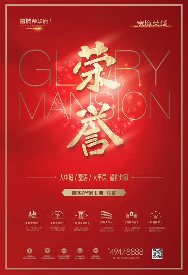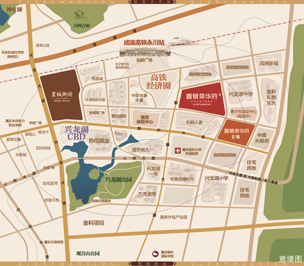 墅居奢华大平层封藏之作 六大产品价值不可复制 13000㎡超大中庭,家在中央公园 比肩一线城市顶级豪宅规划,高规格打造13000㎡奢侈中庭,给您家在中央公园的既视感,惬意享受生活。禅茶意境,两环七景,400㎡户外运动场,500米绿荫休闲环道,600㎡无边际景观泳池,700㎡全龄段童真乐园,8000㎡阳光大草坪,社区邻里中心,五大交流空间,丰富社区生活配套,满足您一切所需 。超大中庭,值得拥有。 超130米最大楼间距,永川前所未有 最大超130米楼间距,中轴距100米以上,永川前所未有。牺牲楼栋,非对称布局,朝向角度考究,无遮挡,无对视,无夕晒,设身处地为每一位居者着想,让家拥有静谧,让生活回归私享。户户通透,采光俱佳,180度无敌视野,中庭美景尽收眼底,远眺耸翠茶山,静聆朗朗书声。视野高度,决定人生高度。 近14米大面宽,墅居奢华大平层 大面宽,窄进深,是一幢好别墅的设计标配,也是户型舒适与否的衡量标尺,近14米大面宽,双厅双主卧四开间横式布局,空间可拓展,户型功能可变,南北通透,每一个功能空间气流通畅,阳光充足。墅居奢华大平层,高于别墅,也超越别墅居住感受。 7.5米横厅大阳台,空中巴比伦花园 7.5米宽奢侈大阳台,1.8米阔绰进深,满足你的所有想象。超大的横厅阳台让屋内洒满阳光,也显得房间格外宽敞和大气。暖阳周末,一杯浓意咖啡,一份下午茶,躺在阳台的藤椅上,享受生活美好。阔景大阳台,你的空中巴比伦花园。 3梯6户高配电梯,上下班不再打挤 3梯6户高配电梯设计,超越市面上大多数的两梯七户、三梯八户乃至十户常规设计,让上下班电梯不再打挤,同时也让电梯的使用频率降低,使用寿命延长,安全指数得以提升。 2.5低容积率奢侈高层,臻品稀世罕见 宜居宜业永川东,寸土寸金兴龙湖,2.5低容积率奢侈高层,臻品稀世罕见,低密度,大中庭,大间距,大社区配套,居住品质与舒适度不逊于任何洋房和别墅。 置业当选兴龙湖 改善首选荣华府 永川置业投资,首选兴龙湖&高铁新城!二者共享,唯置铖荣华府! 置铖荣华,共荣共享! 置铖荣华府 置铖地产继置铖御府之后又一品质标杆项目,秉承置铖地产的尊贵荣华,以高品质、高标准、高规格,继续引领永川人居生活典范。 置铖经典,梦起永川,生于繁华,一脉承袭。 置铖荣华府2期 位于永川区兴龙湖,毗邻永川高铁东站,与兴龙湖中学一街之隔,周边兴龙湖小学、幼儿园一应俱全;项目总占地约150亩,总建筑面积约33万方,其中一期约19万方,二期荣誉组团约14万方;二期规划5栋高层住宅,三梯六户,大中庭、大平层、大阳台理念规划设计,并配套游泳池、运动球场、社区商业,配套完善。 区位图