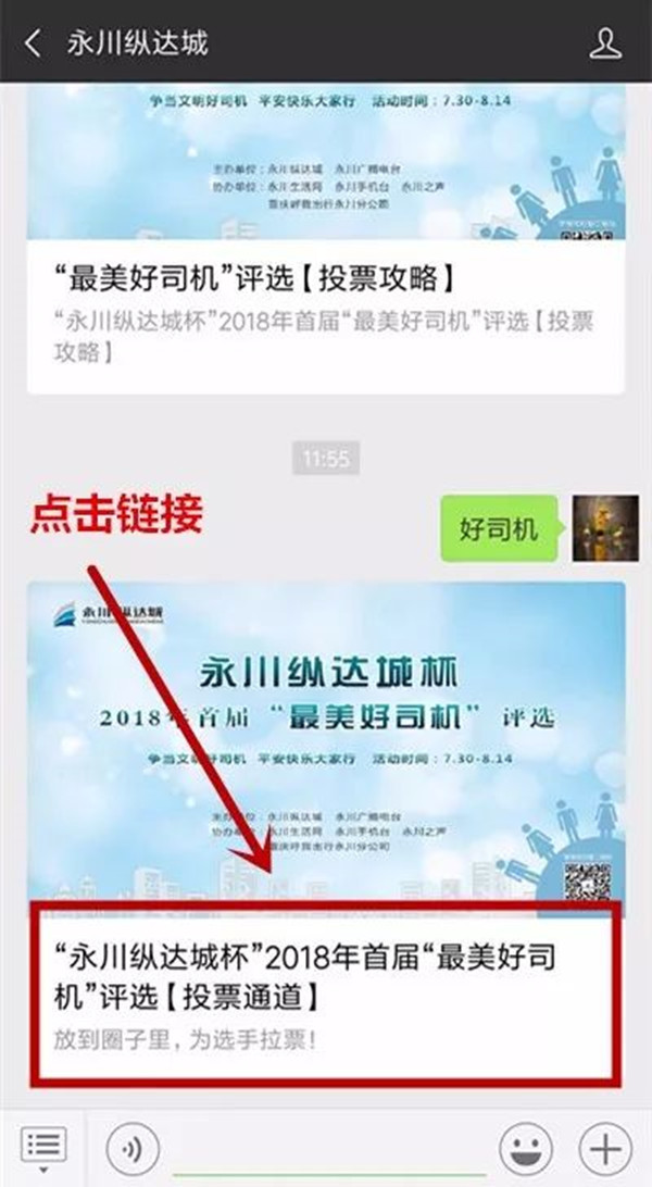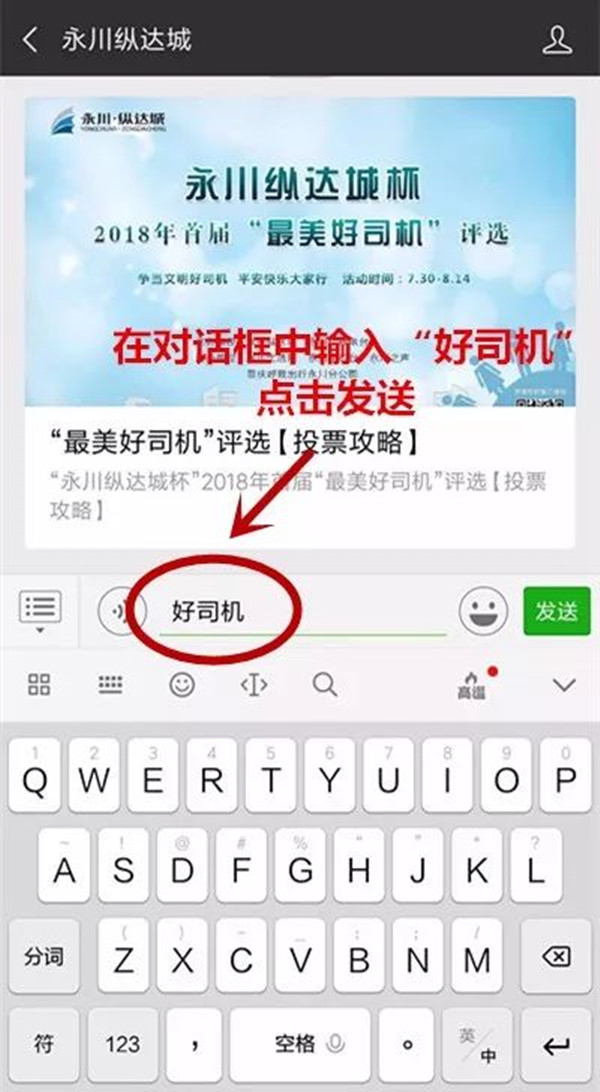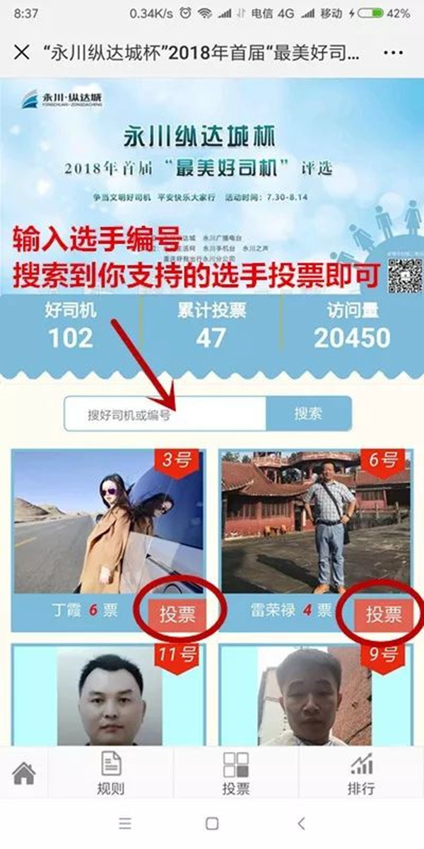 2、在“永川纵达城”微信公众号中回复“好司机”,按照操作提示进行投票。 操作简单 各位选手们抓紧时间 赶快发动亲朋好友 为你投上宝贵的一票吧! 投票须知 1、投票时间:2018年8月6日-8月13日(每日投票时间:8:30-22:00)。 2、投票截止时间:8月13日中午12点截止投票。 备注:投票时间内,每人每天可投3票(同一选手不能重复投票)。 奖项设置 1、“最美好司机”第1名 奖品:价值1500元油卡及**; (票数排名第一) 2、“永川好司机”第2-6名 奖品:价值800元油卡及**; (票数须达1000以上) 3、“文明好司机”第7-11名 奖品:价值300元油卡; (票数须达500以上) 4、“优秀好司机”第12-31名 奖品:价值50元油卡; (票数须达300以上) 5、参与奖 奖品:洗车月卡一张 (10次/月) (票数须达200以上) 备注:所有奖品均需达到所标注的最低票数 声明 1、尊重投票得出的所有结果,并愿意接受该结果。投票不做假、不舞弊。 2、在评选期间如对活动有任何异议,向主办方提出申诉,并保证听从主办方的裁决。认可主办方保留在法律允许的范围内对本次活动作出适时调整和最终解释的权利。 3、提供的报名资料及联系方式正确真实无误,否则由此造成的一切后果由本人承担。 4、请保持电话畅通,如因个人原因没有接听获奖通知电话未亲临颁奖仪式,视作放弃获奖资格。 5、请文明投票,杜绝投票**行为,如系统监测发现投票异常,系统将自动关闭该投票通道,该投票通道在24小时后自动开启。该参选司机投票通道关闭前2个小时的票数将被扣除。 6、参与比赛即同意个人资料及形象使用于与本次大赛相关的新闻宣传、广告宣传。 你的每一票 都是对正能量的认可与坚持 让生活处处充满正能量 就在 永川纵达城杯 2018首届最美好司机 大家赶快,投起来!