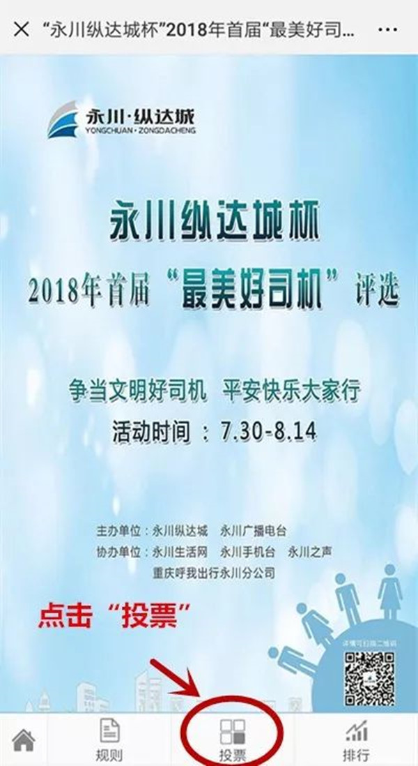 这104名蓄势待发的好司机们 期待着你的认可! 另外,生活君贴心的为大家整理了 一份投票攻略 请查收! 投票方式 1、扫描下方二维码,进入“永川纵达城”微信公众号;