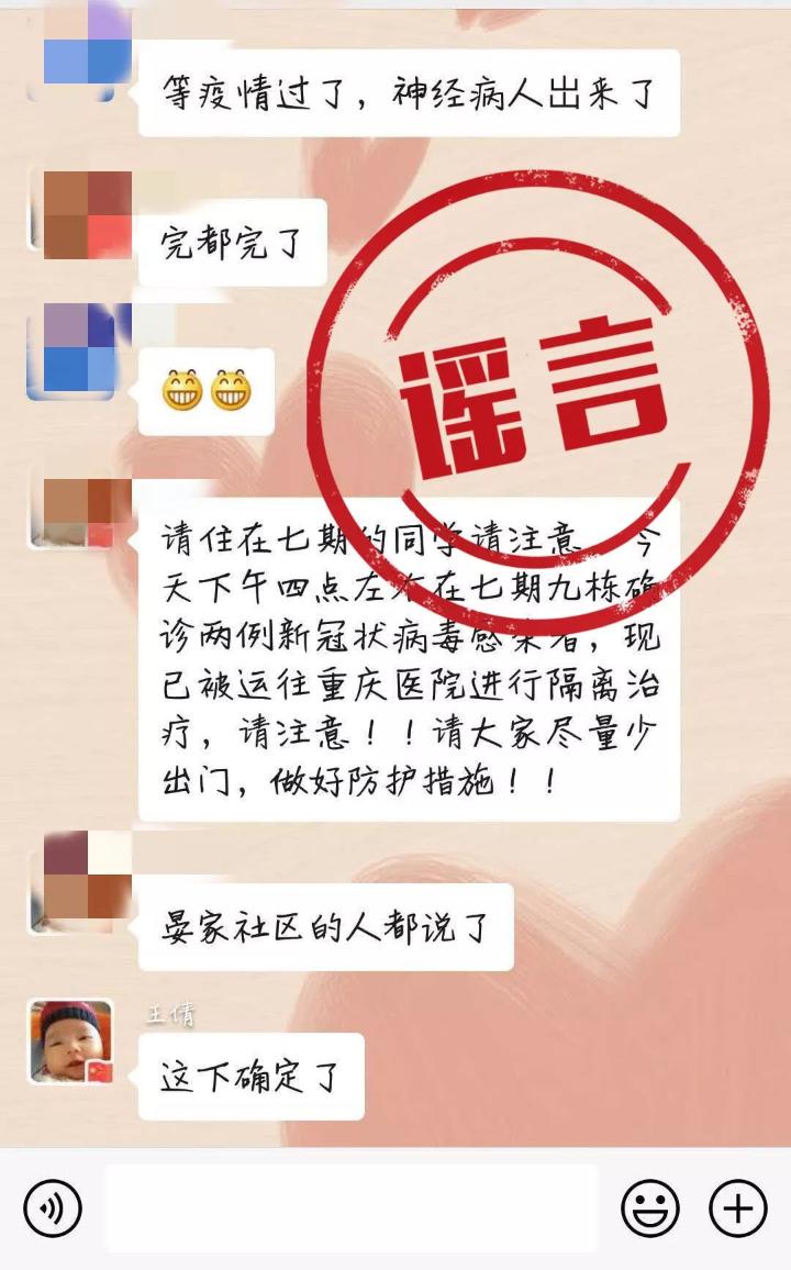 谣言3:长寿晏家街道2例新冠肺炎感染者被重庆医院运走[size=17.068px]真相来了 [size=17.068px]8日,微信群有消息称:长寿区晏家街道安置房7期9号楼出现2例新冠肺炎感染者,并被重庆的医院拉走,且JC和协警十几人封锁了整幢楼的进出人员。 [size=17.068px]经长寿区卫健委和晏家街道核实:此消息不实,长寿区晏家街道至今无确诊病例,疑似病例均已隔离,街道所有居民楼也并未被封锁。消息中提到的救护车并非重庆主城的救护车,而是长寿区第三人民医院的救护车;被接走的两名患者确诊的疾病是细菌性肺炎,而非新冠肺炎,现正在长寿区第三人民医院内科住院治疗。
