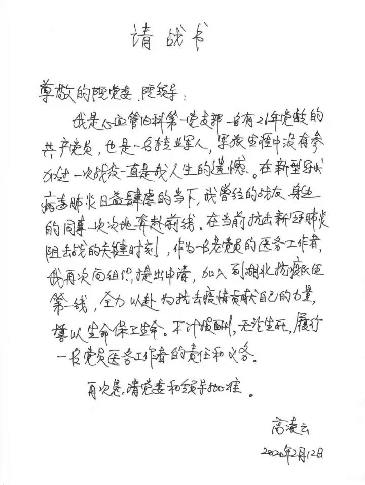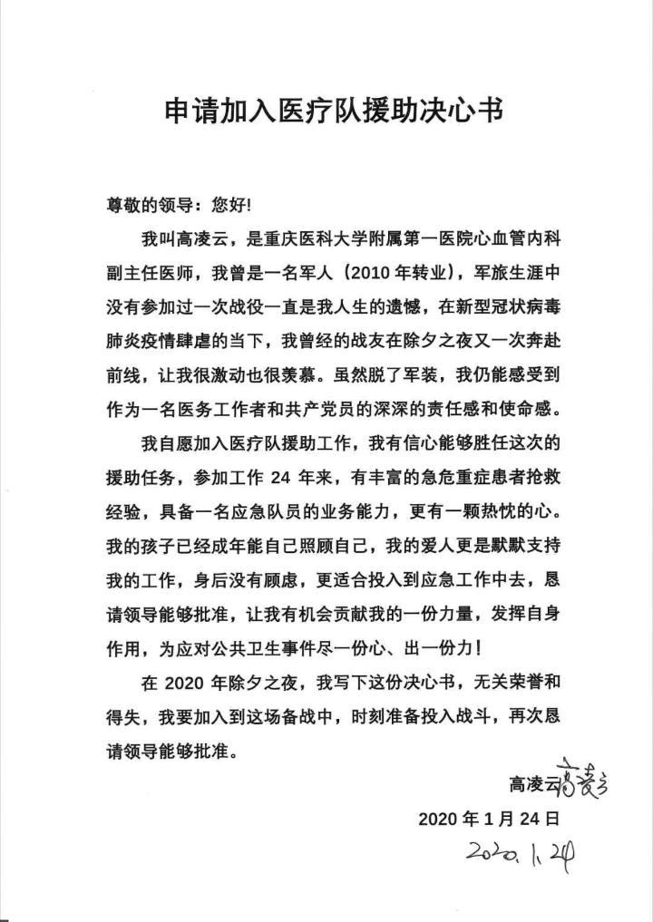 “我是一名有26年党龄的党员,也是一名转业军人,我必须去!”重医附一院心血管内科副主任医师高凌云在请战书中这样写道。