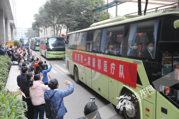 2月13日下午1点半,重医附一院160名医护人员乘坐大巴前往机场,奔赴武汉。华龙网-新重庆客户端记者 张质 摄