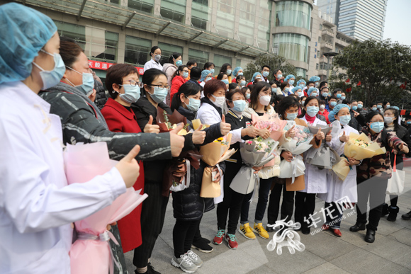送行仪式上,家人、同事们一起为即将出发的医护人员加油。华龙网-新重庆客户端记者 张质 摄