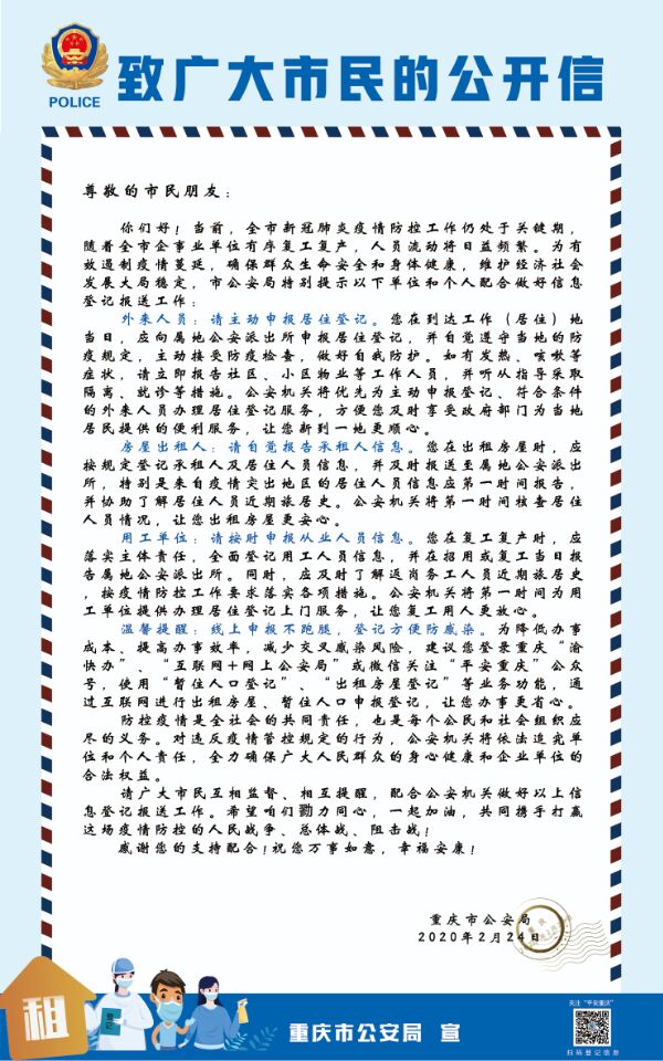 重庆警方致市民的一封信。警方供图 华龙网-新重庆客户端2月24日11时20分讯(记者 阙影)当前全市企事业单位有序复工复产,为防止因人口流动引发疫情扩散蔓延,今(24)日,重庆市GA局发布《致重庆市民朋友的公开信》,倡议市民遵守疫情管控规定,配合GA机关做好信息登记报送工作,对违反疫情管控规定的行为,GA机关将依法追究单位和个人责任。 市GA局在信中表示,当前全市仍处于新冠肺炎疫情防控工作的关键期,特意提醒外来人员在到达工作(居住)地当日,应向属地GA**申报居住登记,并自觉遵守当地的防疫规定,主动接受防疫检查,做好自我防护,GA机关将优先为主动申报登记、符合条件的外来人员办理居住登记服务,以便市民及时享受当地ZF部门提供的便利服务,住得顺心;房屋出租人在出租房屋时,应按规定登记承租人及居住人员信息,并及时报送至属地GA**,对来自疫情突出地区的居住人员信息应在第一时间报告,GA机关将第一时间核查居住人员情况,房屋租得安心;用工单位复工复产时,应落实主体责任,全面登记用工人员信息,并在招用或复工当日报告属地GA**,GA机关将在第一时间为用工单位提供居住证上门办理服务,让单位复工用人更放心。 为降低办事成本、提高办事效率,减少交叉感染风险,市GA局在信中提醒市民尽量通过登录重庆“渝快办”、“互联网+网上GA局”或微信关注“平安重庆”公众号,使用“暂住人口登记”、“出租房屋登记”等业务功能,通过互联网进行出租房屋、暂住人口申报登记,让大家办事更省心。