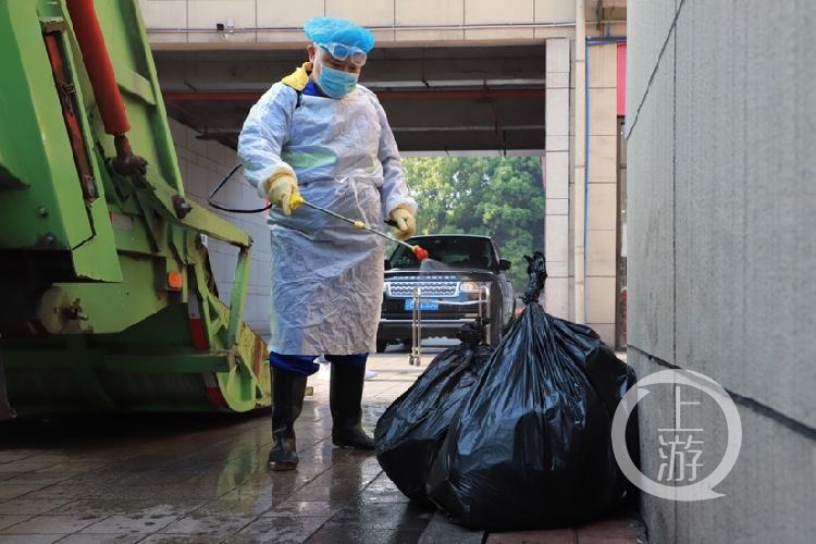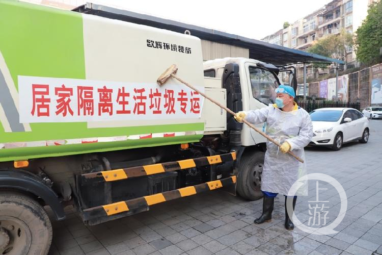 一辆绿色与白色相间的隔离区生活垃圾转运车旁,重庆市南岸区城管局环卫处工人张校红先整理防护帽和防护镜,又检查了身上的防护衣和**的手套,然后开始对耳隔离区的生活垃圾进行收运。