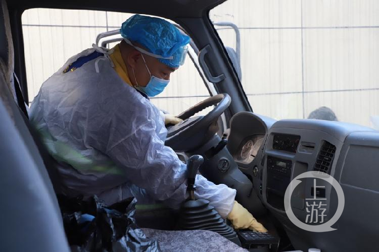 转运隔离点的生活垃圾,这项重要而又艰巨的任务是张校红主动要求的。但一开始这项工作进行得并不顺畅。 首先,穿防护服就是一个困难事。“我身材有点胖,防护服要从下面拉上来,我一弯腰就有点费劲。”张校红不好意思地说。 微胖的张校红要背上喷洒消毒箱也是一个“坎”。他得先把左边肩膀深深地往一边倾斜,手臂穿过喷洒消毒箱的肩带,挂上左肩后。再倾斜右边的肩膀,再把肩带挂在右肩上。 “这样的动作每天要重复十来次。”每到一个隔离点,张校红就要背上喷洒消毒箱进行操作,离开隔离点,又要取下喷洒消毒箱放回驾驶室,如此反反复复。 张校红对消毒水的味道非常过敏,“就算戴口罩,只要一喷洒消毒水,鼻子会止不住地发痒,忍不住想用手背揉一揉。”